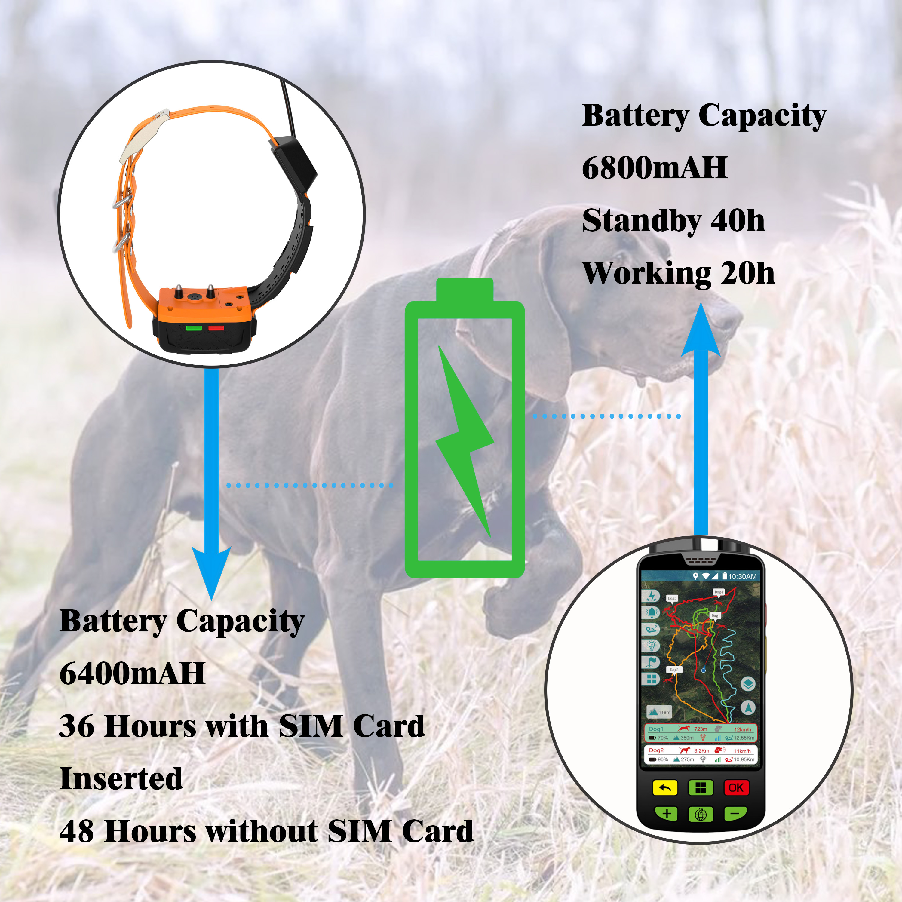 - Long Battery Life: The handheld unit is powered by a high-capacity 6800mAh battery, and the collar device uses a 6400mAh battery, providing up to 10-20 hours of continuous use.