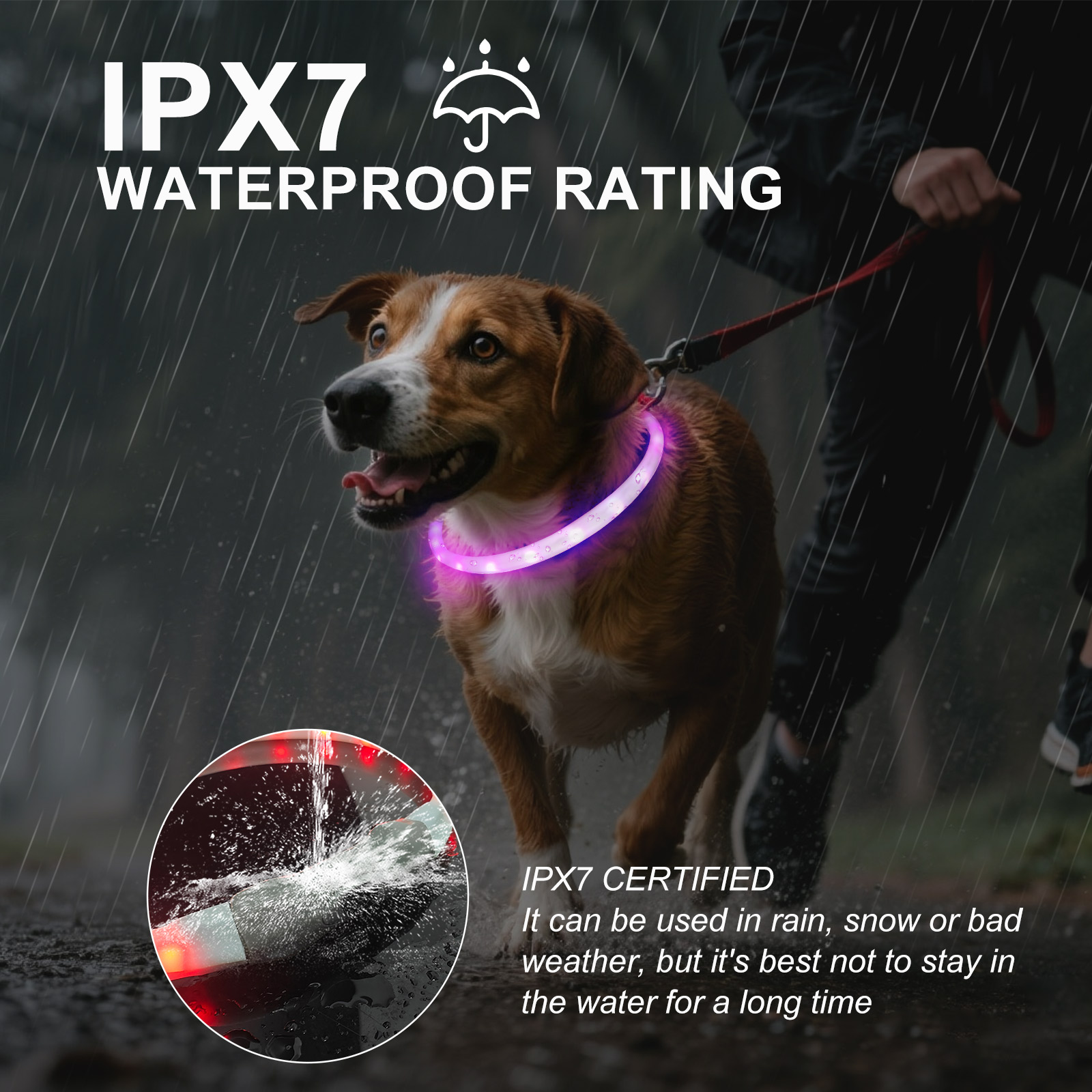 - IPX7 Waterproof Rating: Offers complete protection against water, allowing your pet to wear it in the rain or while playing near water.