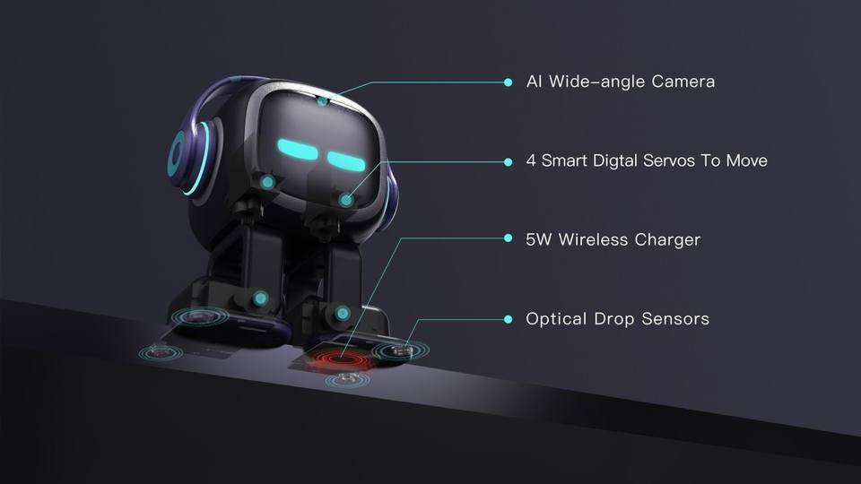 Autonomous Behavior: Explores your desk autonomously, dances to music, and reacts to environmental sounds.