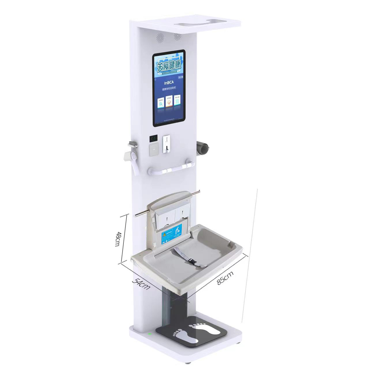 This advanced health kiosk by INBCA Medical Corp integrates ultrasonic height measurement and high-precision weight sensors to provide a comprehensive, self-service body composition analysis solution for public spaces, hospitals, and gyms.