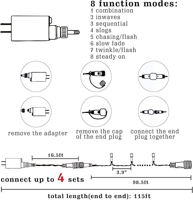 These lights are versatile for various decorative purposes. Primarily designed for Christmas trees, they can also be used to adorn gardens, patios, windows, and indoor spaces. The warm white light is perfect for creating a traditional holiday ambiance. The low-voltage design ensures safety around children and pets and reduces energy consumption significantly compared to traditional incandescent lights.