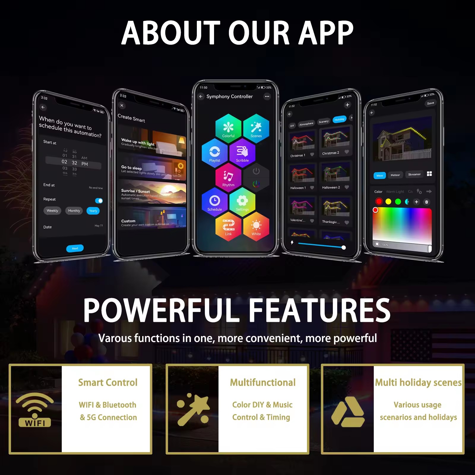 This product is a high-quality LED holiday decoration light designed for permanent outdoor use. It features smart WiFi control, IP68 waterproof rating, and vibrant RGBW color options, making it ideal for festive occasions and architectural lighting.