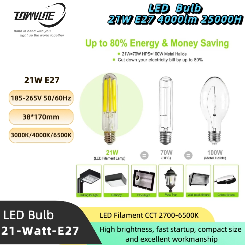 This product is a high-efficiency 21W E27 base LED filament bulb designed as a direct replacement for traditional high-pressure sodium lamps in street lighting applications. Manufactured by Changzhou Townlite Lighting Electric Co., Ltd., it boasts a high luminous efficiency of 180 lm/W and an extended lifespan of up to 25,000 hours. Key features include support for dimming, a transparent design for clear light emission, and a wide input voltage range of AC 185-265V, making it suitable for various outdoor lighting environments.