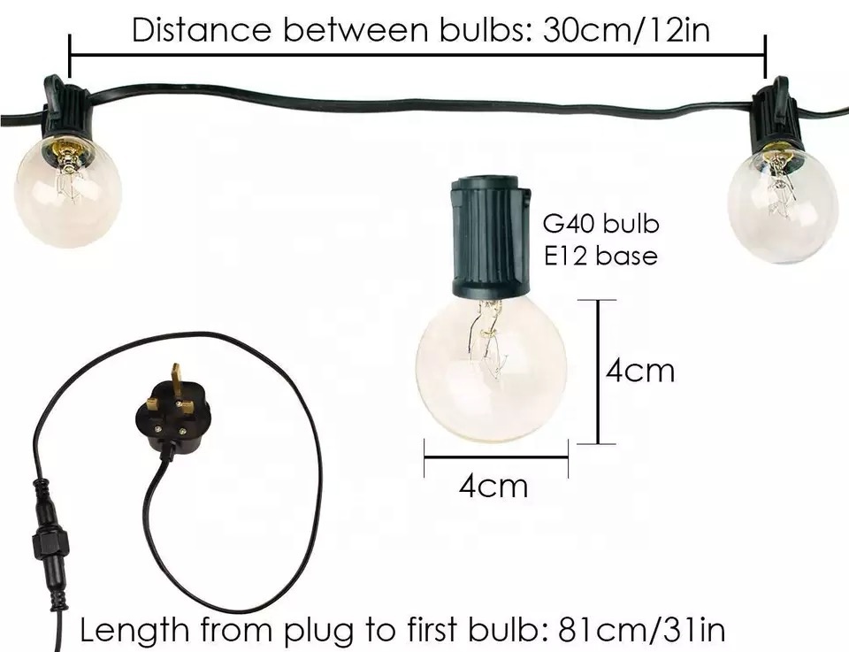 Packaging: Typically sold in sets (e.g., 25 bulbs per set), with the cord and bulbs integrated. Replacement bulbs (G40 E12 base) can be purchased separately if needed.